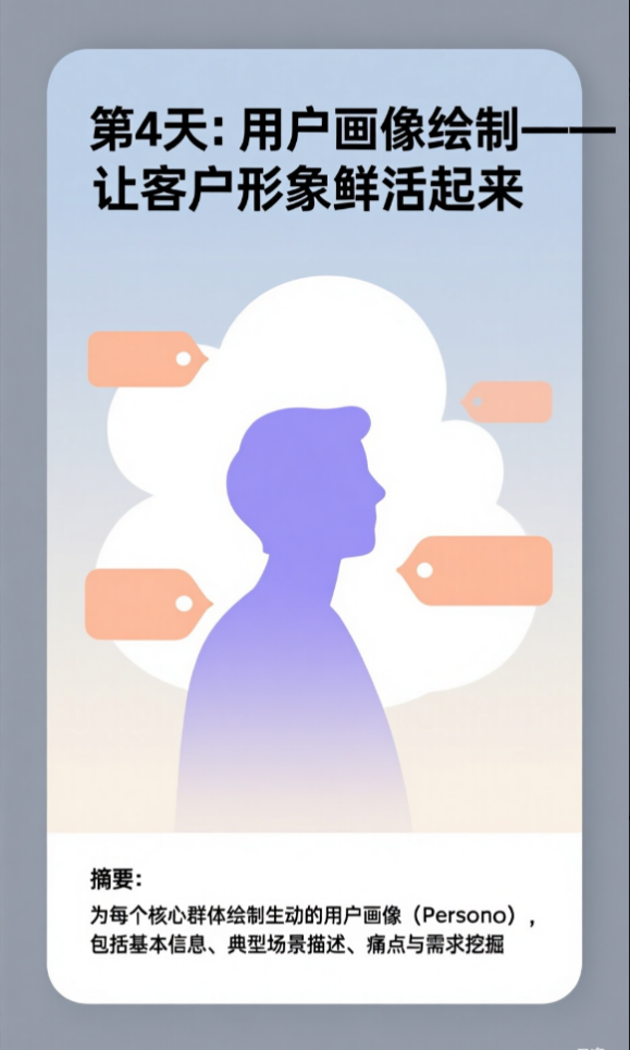 核心目标:为每个核心群体绘制生动的用户画像(Persona)。操作明细:1. 基本信息勾勒:包括年龄、职业、收入、家庭状况等基本信息。2. 典型场景描述:描述该客户在日常生活中使用产品的典型场景。3. 痛点与需求挖掘:结合前期调研,明确该客户的核心痛点与需求。案例参考:某咖啡品牌为其 “都市自由职业者” 客群绘制的画像包括:”李小姐,28岁,...