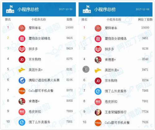 11月6日,阿拉丁指数发布了11月周的小程序榜单。有了这些榜单,我们可以看到小程序这段时间的趋势。1.以下是10月末以及11月周的小程序总榜单上图的小程序总榜单对比看出,摩拜单车符合目前用户对出行类小程序的市场需求,一如既往排列在首位。排列第二为蘑菇街女装精选,第三为拼多多商城。这类电商小程序的指数保持提升,提现了用户对电商的需求,也有可能是双十一活动促销,...